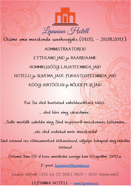 Telefon 44 65 024; 44 37368; e-post: lepanina@lepanina.ee
