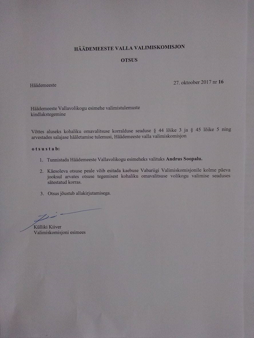 16. Häädemeeste Vallavolikogu esimehe valimistulemuste kindlakstegemine